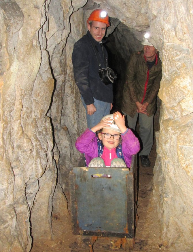 Once the other group had emerged from the depths it was time to swap over. We donned mandatory hard hats and lights and entered the mine. The walk followed the rails up the incline and onwards down the main 'Goodluck Lead Vein' which was remarkably narrow. The hard hats were not just decorative, as headroom was VERY limited in places! About halfway there was a similar riding truck to that outside and, with a bit of negotiation and pre-service test runs all managed a short underground trip in similar fashion to outside. There is an extensive tunnel system (some only accessible to caving and potholing experts) on different levels and over half a mile of 11" gauge (one original branch with wooden track).The only other rolling stock seen was a flatbed equipment truck inside. The internal temperature is a surprisingly constant 8-10oC throughout the year.