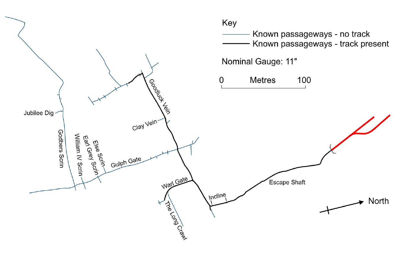 An original plan based on the the mine records supplemented by a survey on our 23 Oct visit. The external outdoor section of the railway covered by all participants is in red, the underground railway section is black. The 'Warl Gate' branch still has original wooden track. Other passages without track are shown in blue; the incline is 'down' to the mine. There are other passageways (without track) at different levels.