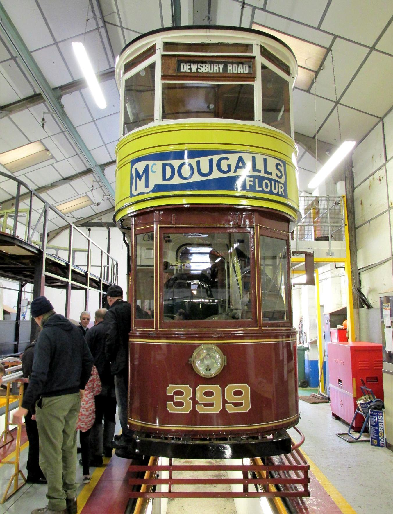 The lower deck of the tour tram inside the Road 2 shed, about halfway along, with