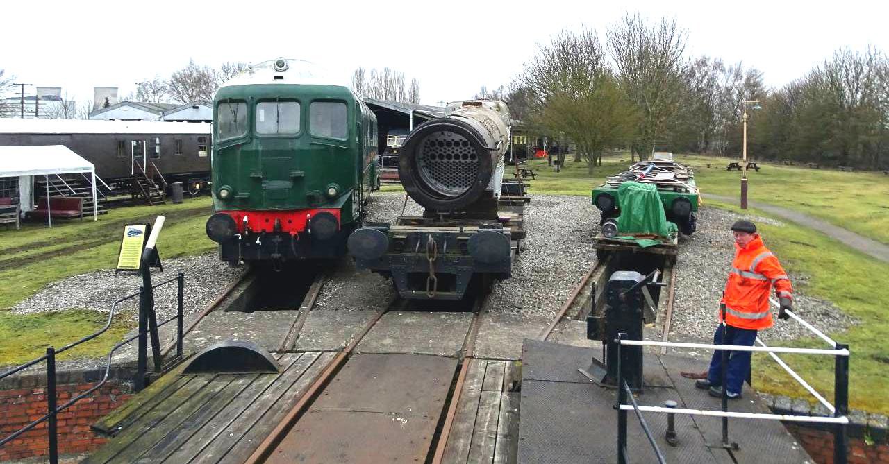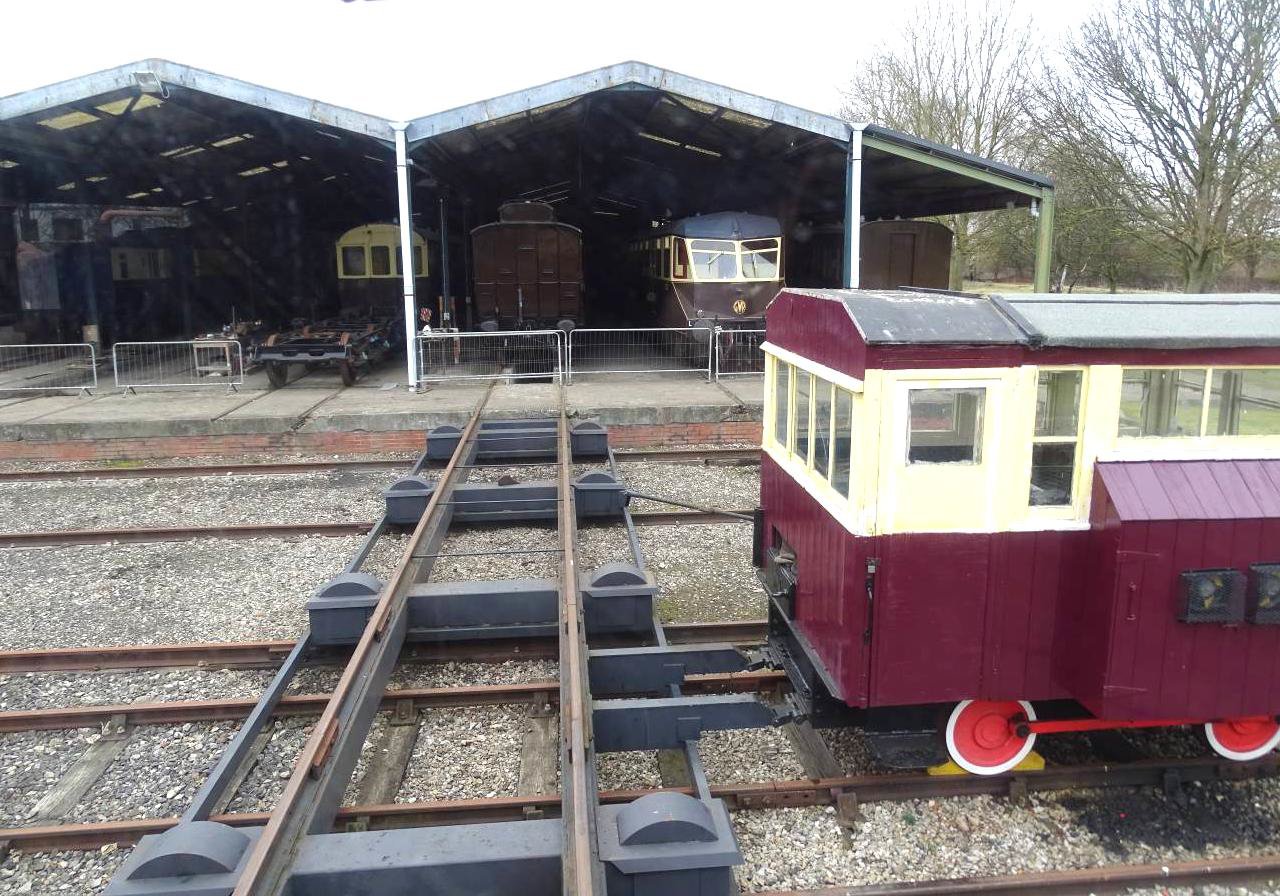 Our railtour motive power was green liveried 08604 with the very suitable Hawksworth auto trailer 231 built at Swindon in 1951 giving plenty of room, comfort and visibility. The fixture was in two parts, the morning run covered the route linking the GWS 'mainline' to their branch down to the Transfer Shed. This also included the mixed gauge section, overlapping with the broad gauge track at its platform. For obvious reasons our train was unable to complete the rest of the broad gauge section (!) but did manage a first for a passenger train by running into the Steam Rail Motor Shed. The rest of the morning's highlights included a run onto the traverser, almost into the Carriage Shed and over the turntable. The traverser originally operated at the Midland Railway Works, Derby and was built in 1897. Initially steam shifted this was later replaced with an electric engine and it is now petrol powered. The 21-metre Ransomes & Rapier (1869 -1987) turntable and pit is on the site of the original 1932 GWR one. Somewhat out of place, it was actually built for the Southern Railway at Southampton Docks. A leisurely lunch break followed, allowing plenty of time to revisit the café, socialise, explore the site and 'spot' locos and stock. DRC carried out several shunts to free up access for the afternoon running by moving stock to the lines already covered. Those lunching in the café were entertained by an unlikely procession of rolling stock and dead locos passing the windows hauled by 08604.