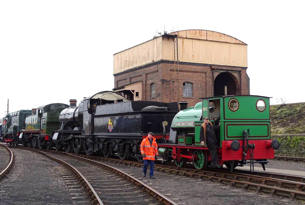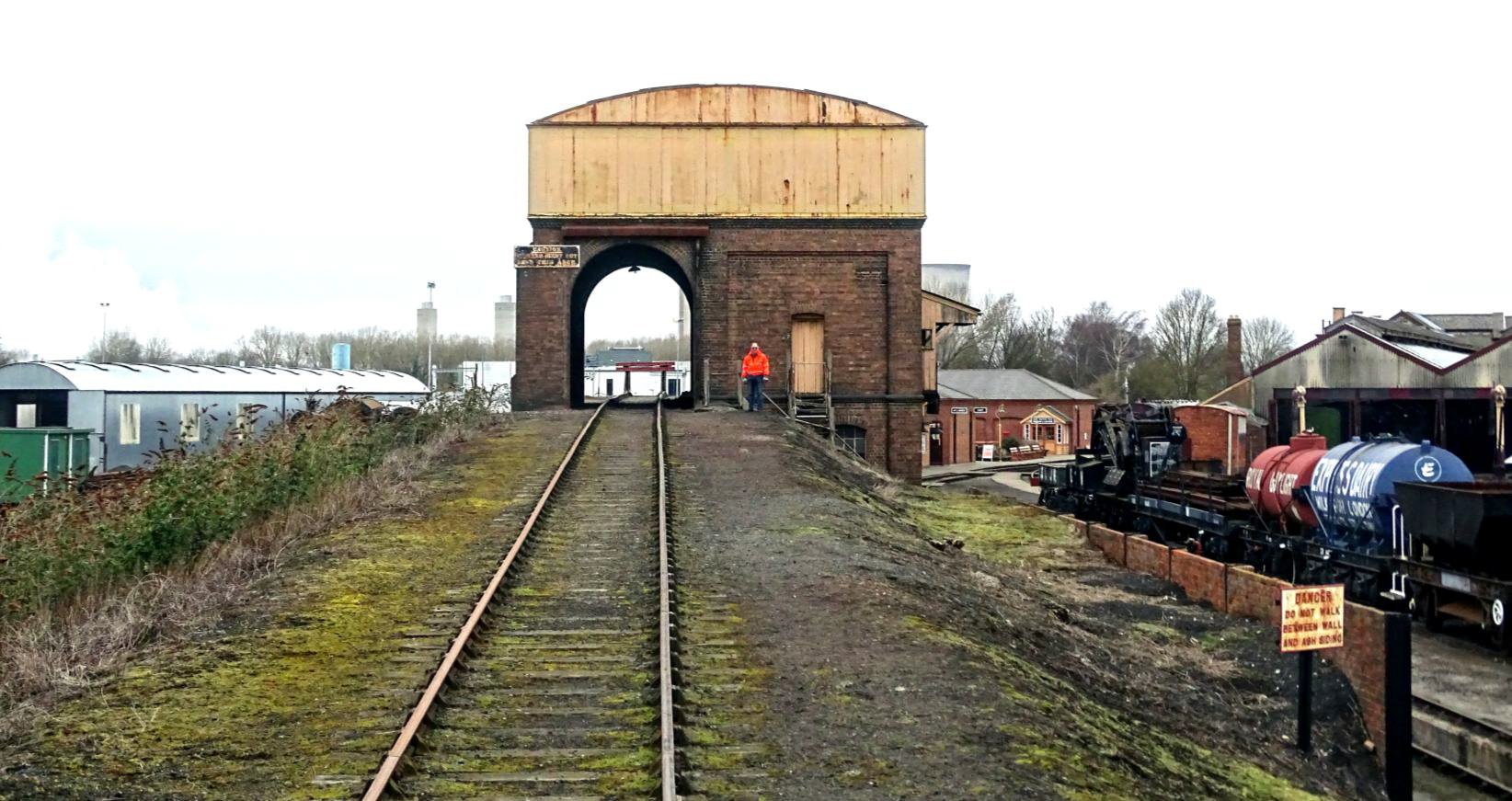 The stage was then set for a grand finale … the first ever passenger run up the steep incline to and through the coal stage. The novelty was confirmed by the sudden appearance of what seemed to be every GWS volunteer on site with their cameras. The loco was not permitted to enter the building due to a weight restriction, so the tour stopped a coach length short of the end (but was propelled through the building). The stage is used to coal and water the steam locos. Coal is brought up the incline into the shed in rail wagons and manually unloaded into small wagons which are subsequently tipped into the loco tenders.
