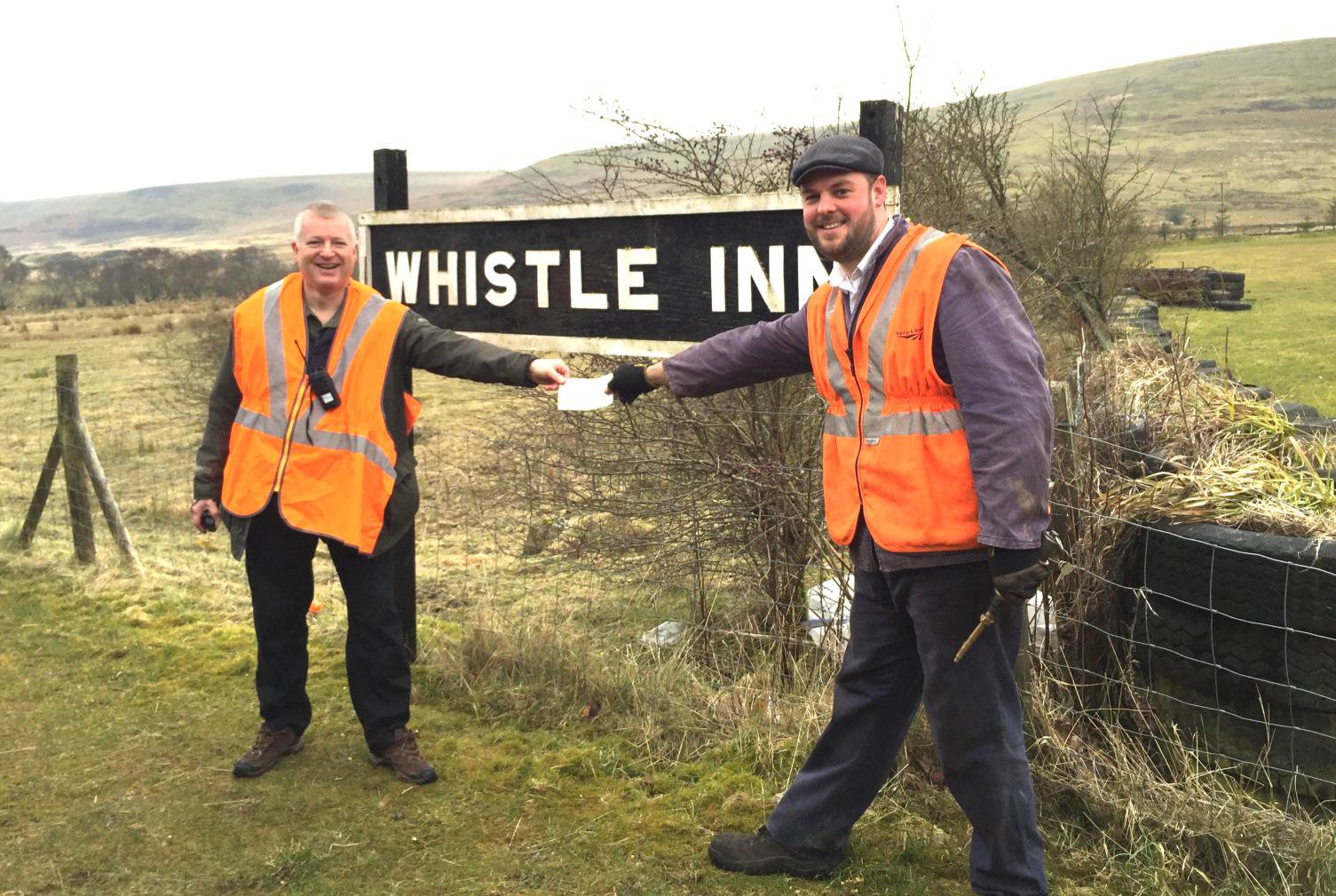 5511 was put into gear, actually its only gear and the tour set off 'top and tail' up/Up (in both senses of the word) to Whistle Inn. The pace was such that some furious hand gestures and radio calls soon had 1344 assisting from the rear, and not for the last time on the day. Some PW trolleys were passed under test on the line, which has a conveniently stiff gradient that match NR test criteria. They are from a local engineering firm who use the line many times a year for testing and training when there are no passengers about, a good source of income. The train kissed the buffers beyond the platform at the summit (1,305ft) of the line and set back to the platform for photos. Then there was a ceremonial cheque presentation to the P&B in front of the station name board, which was a bit of a stretch and surely tested the physical if not financial integrity of the cheque! Back down the gradient 1344 drew the train into the loop (right) at Furnace Sidings pausing to refill the radiator. Some coolant had boiled off earlier, with a steamy shroud that would have put any of the line's real steam locos to shame.