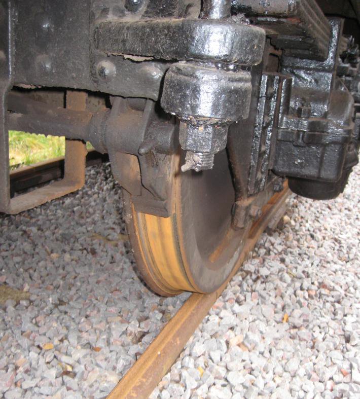 A wheelset on the train showing rust on the wheel tread picked up from the rail during the