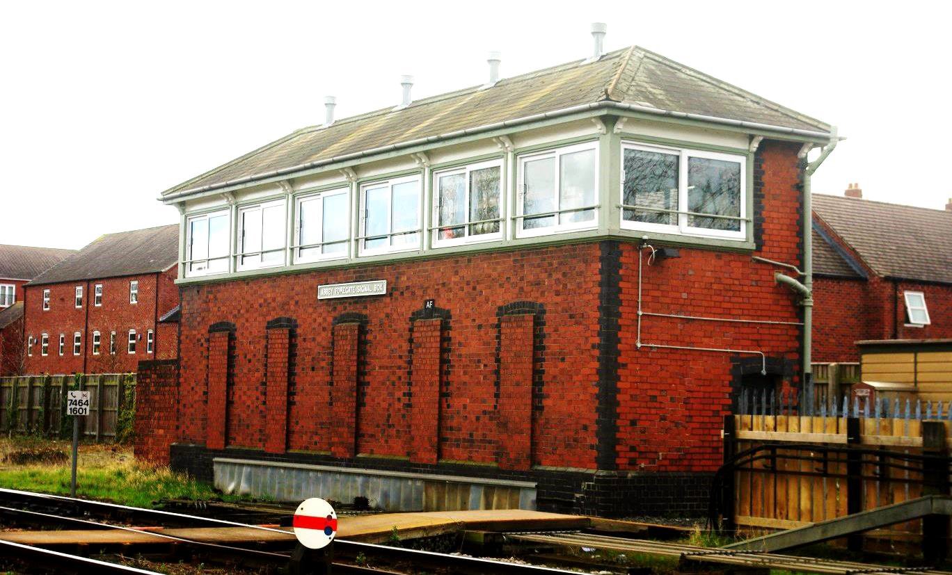 Abbey Foregate signal box is a 1914 built GWR brick to roof, hipped roof design, although the