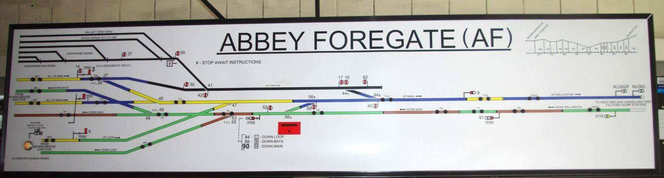 Towards Wolverhampton the lines are worked by Track Circuit Block to (since November 2012) the West Midlands Signalling Centre, Saltley. Train description on this line is by computer and VDU. Although there is no signal slotting or acceptance as such, Abbey Foregate's No1 Up Main Home (from P7) semaphore signal (No3) is released by Severn Bridge signal box clearing their No13 signal (a release/ interlocking lever), effectively the starter signal for the No1 Up Main line. If Abbey Foregate clears their signal first, Severn Bridge are not able to clear theirs and vice versa maintaining a safe method of operation. There are two GWR electric train route describers which, although no longer working, impressively still have their brass surrounds highly polished. All the points are mechanical but the original junction bracket signal just outside the box is now a colour light head with theatre light route indicator, replacing the former large rather splendid semaphore gantry.