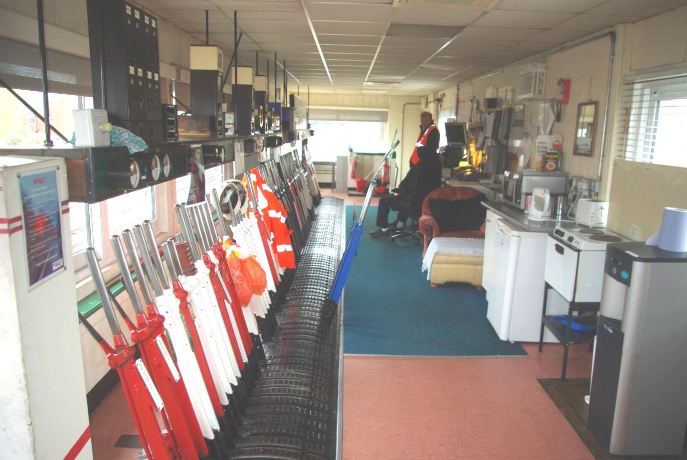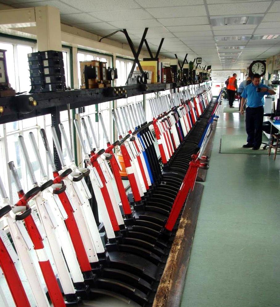 The frame is staffed by two signallers 06.00 to 22.00 daily (SuX) on 8-hour shifts and at all other times one. To this day, each signaller works one end of the frame, there being an 'imaginary line' splitting the territories in the gap between levers 88 and 91. There were tales of days gone by where duty signallers ('signalmen' then) would not even talk to each other. One told of the signaller on the end further from the toilet having to request permission to pass through the other signaller's domain to use it! The frame is 180 levers long; about half are in use including '1' and '180', with quite a few white (spare) levers but fewer spaces. Some with short handles are 'interlocking levers' and plated as such. They are the result of previous changes and no longer operate anything themselves but are part of the interlocking sequence.