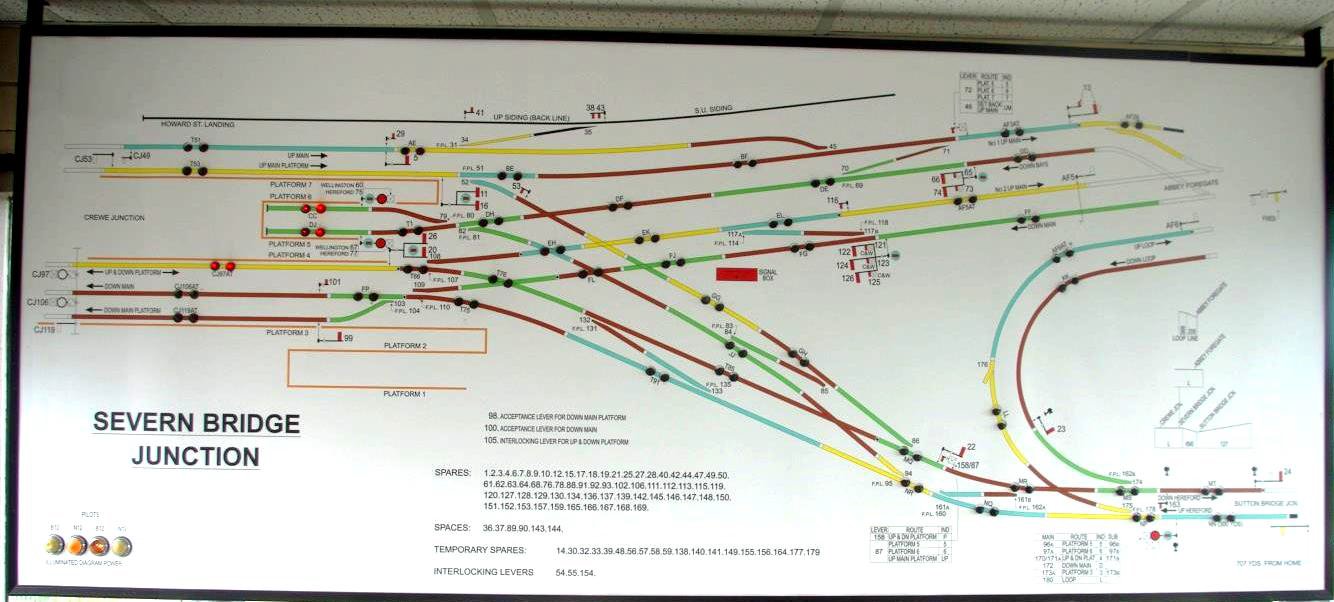 with a number of white (spare) levers and spaces. It works Absolute Block to Severn Bridge Junction,
