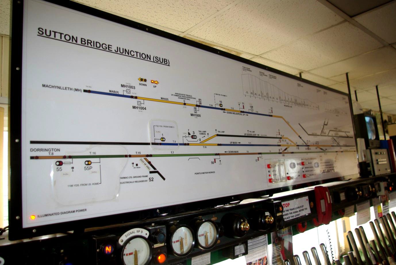 Sutton Bridge Junction controls the junction between the Hereford route and the Cambrian route to Aberystwyth. Until September 1963 it was also the junction for passenger trains to the Severn Valley line to Bridgnorth and Hartlebury (etc). A headshunt was later retained to serve Shrewsbury Abbey oil terminal (CG 17 July 1988). Now, apart from the original bridge over the start of that route by the box, the track bed has been built over. It is another GWR brick built 1913 box, an original 61-lever frame with several white levers and a few spaces from the reduced layout under control. As with Abbey Foregate and Severn Bridge Junction, a blast wall had been built around the entrance door, and the locking room windows bricked up during WWII due to the local armament establishments.The box works Absolute Block to Severn Bridge Junction and, in the other direction, to Dorrington on the Hereford route with ETRMS to Machynlleth on the single Cambrian line to Welshpool. Surprisingly it can be switched out, leaving the signals clear for the Hereford route in both directions.