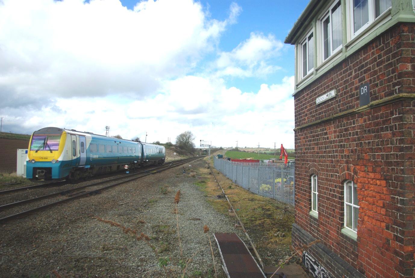 Dorrington Signal Box (6m 25ch) was next, merely a section break with a trailing crossover (used quite frequently for Engineers' trains and single line working). It now has more white (spare) levers than the number in use, with the station and yard long since closed. Indeed the box is set well back from the railway following removal of the Down loop. It is an 1872 LNWR/GWR Joint Line design with a low hipped roof but has new double glazing units. The current frame dating from 1941 also controls an Intermediate Block Section on each line, useful at times of disruption and when freight traffic used to be heavier. The box is about halfway along the climb from Sutton Bridge Jn to just beyond Church Stretton. Dorrington also has a 'closing switch', normally used each night to extend the section from Sutton Bridge Junction (or even Severn Bridge Junction if the latter is switched out) to Marshbrook signal box, the next one south and beyond Church Stretton station. Church Stretton had a signal box that closed abruptly with severe flooding in the year 2000 and was not repaired. Marshbrook stays open as it controls a level crossing and was not visited but is another LNWR/GWR Joint Line design