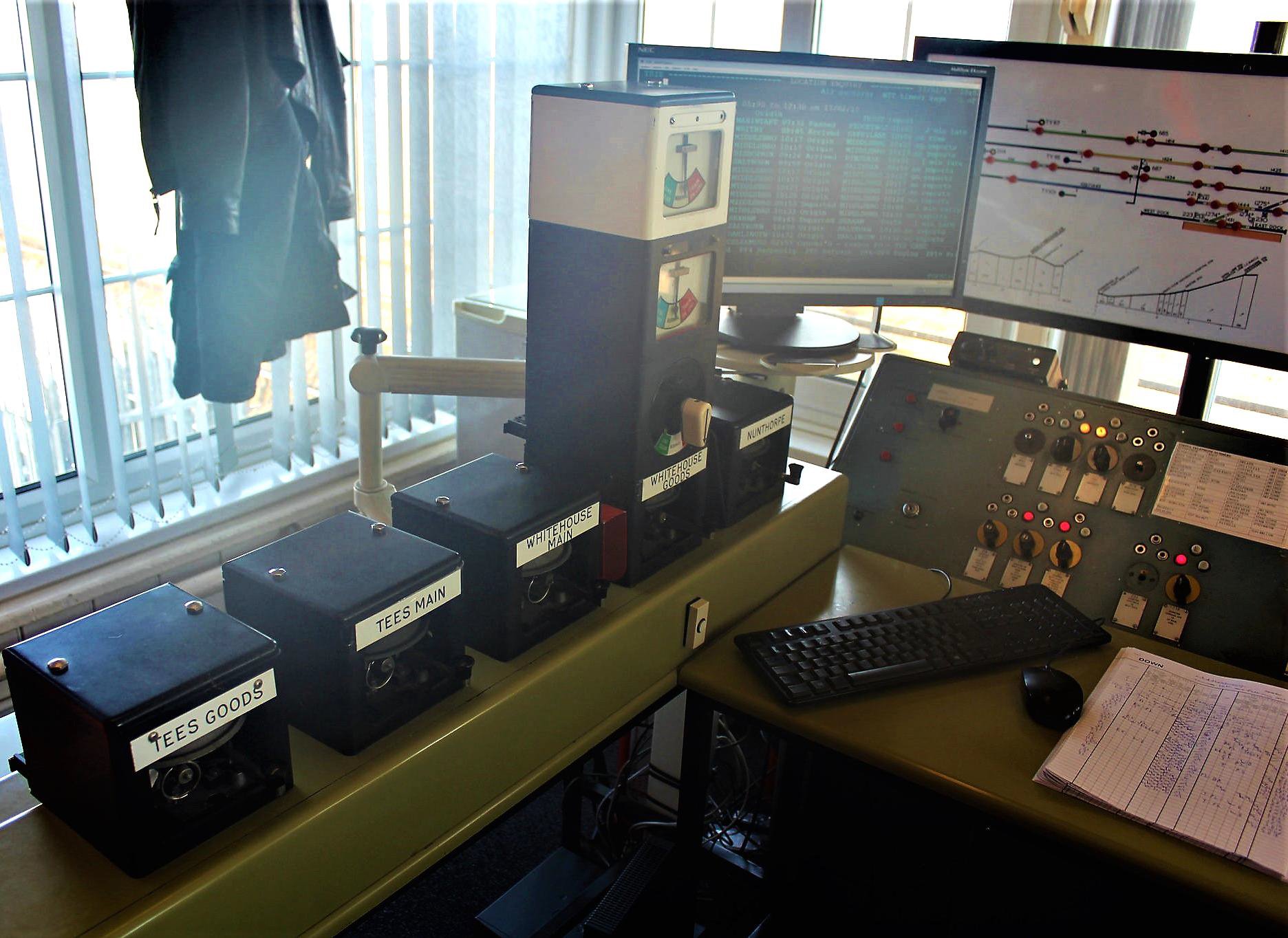 Nunthorpe was our last visit, now the only box on the Whitby line. The signaller controls the entire branch and has a 'mimic diagram' to 'track' the trains manually; magnets can be placed on the sections to identify their locations. Drivers are given permission by telephone to withdraw key tokens (Tyers No9) from the instruments at Battersby, Glaisdale and Whitby and the intermediate instrument at Grosmont (for movements on and off the North Yorkshire Moors Railway). The points at Battersby, where trains reverse, are not controlled but work automatically for arriving trains on a first come, first served basis. Battersby has the only signals on the branch which, together with the points, work for departures by the withdrawal of the appropriate token. They can also be operated by a route set plunger, which must be used if either a train is delayed in leaving the station and the points indicator has reverted to 'not set' (red) or a movement is required without a token being withdrawn.