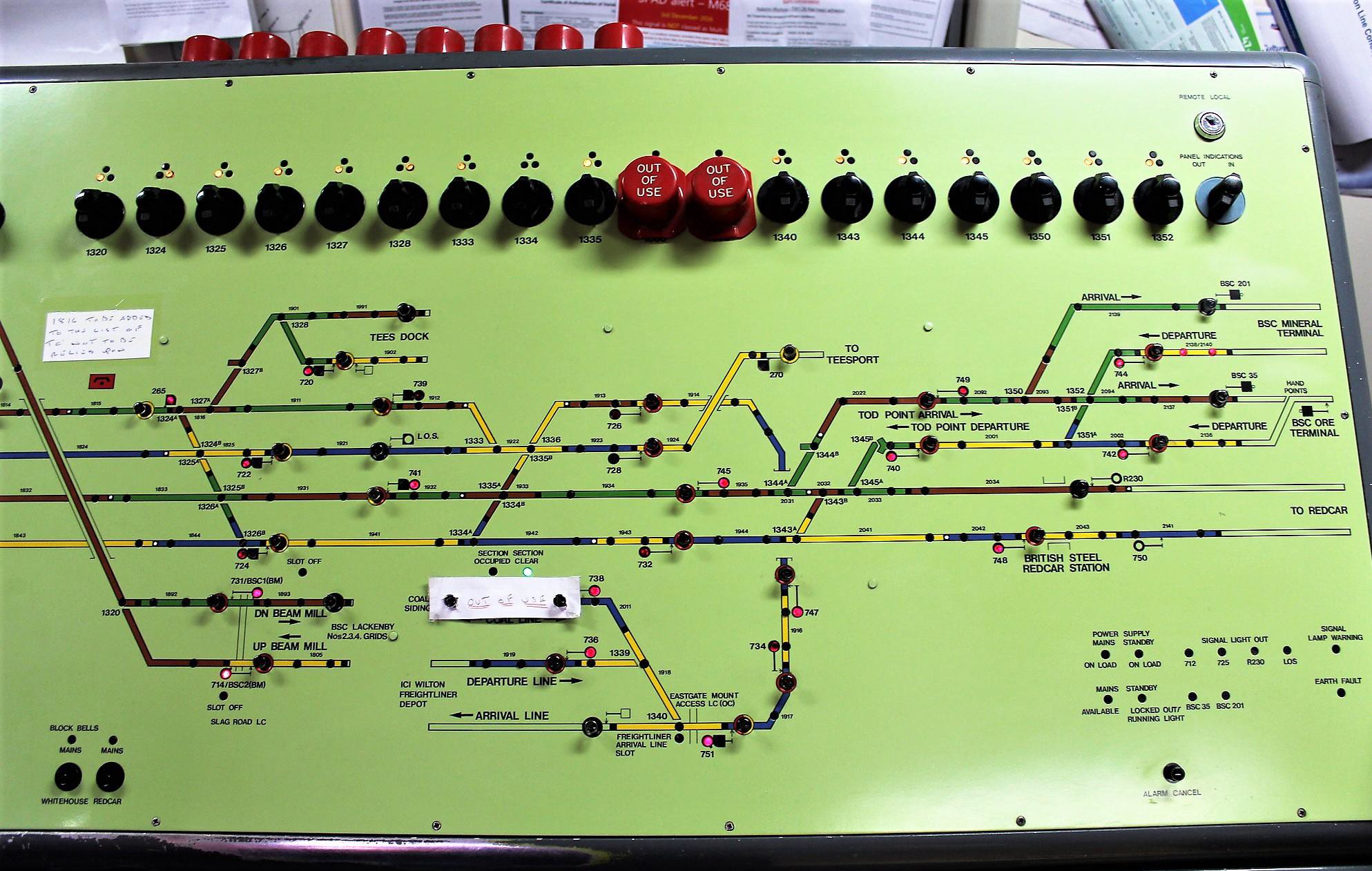 [© John Cowburn 2017] Tim wished to go to Grangetown box on the afternoon shift as he did not want to impose a group of visitors on the relatively new morning shift signaller, so we headed for Redcar, an LNER type 13 box dating from 1937 with an IFS panel installed in Feb 1970. It controls a busy level crossing and is very close to the road. Because of this there is an extension jutting out over the pavement with a glass panel in the floor for the signaller to see pedestrians directly beneath. The crossing has prototype sliding gates, with pads to detect obstructions when closing, because there was insufficient room to install barrier equipment without demolishing the box. These replaced the old life-expired NE Region motorised boom gates. The box controls a Down loop east of the crossing and Church Lane Level Crossing beyond. Long Beck is a tiny 1932 LNER type 12 box. Four at a time just about fitted in. It survives to control a level crossing. An IFS panel was installed on 8 Feb 1970 to supersede Saltburn Station and Saltburn West Jn boxes; another panel replaced the lever frame on 13 Sept 1980. The former Up Main is now the single line access to the station. Occasional loco hauled trains run to/from Saltburn. These run round in the Jubilee Sidings; No2 was the Down Main, connected at the east end by a ground frame. The shift change had taken place so we retraced our tracks to Grangetown, the largest box visited. All four running lines have to be crossed to reach it so Tim obtained permission to do this safely by phone. Although dating from 1954 it is an LNER type 15 box, with significant alterations. There is an NX (Entrance Exit) panel commissioned 4 Dec 1982 with a replacement fascia plate circa 2005. The writer surmises that a much larger box was required here for the new lines that opened in the area after the War: ICI Wilton (1946/47); the Beam Mill Jn to Lackenby Grids flyover line (unknown date after 1951); Tees Dock (c1963); Teesport Shell refinery (1968) and Redcar Ore & Mineral Terminals (25 Mar 1973). Although the oil refinery closed in 1984 and the line is now lifted it is still shown on the panel! |