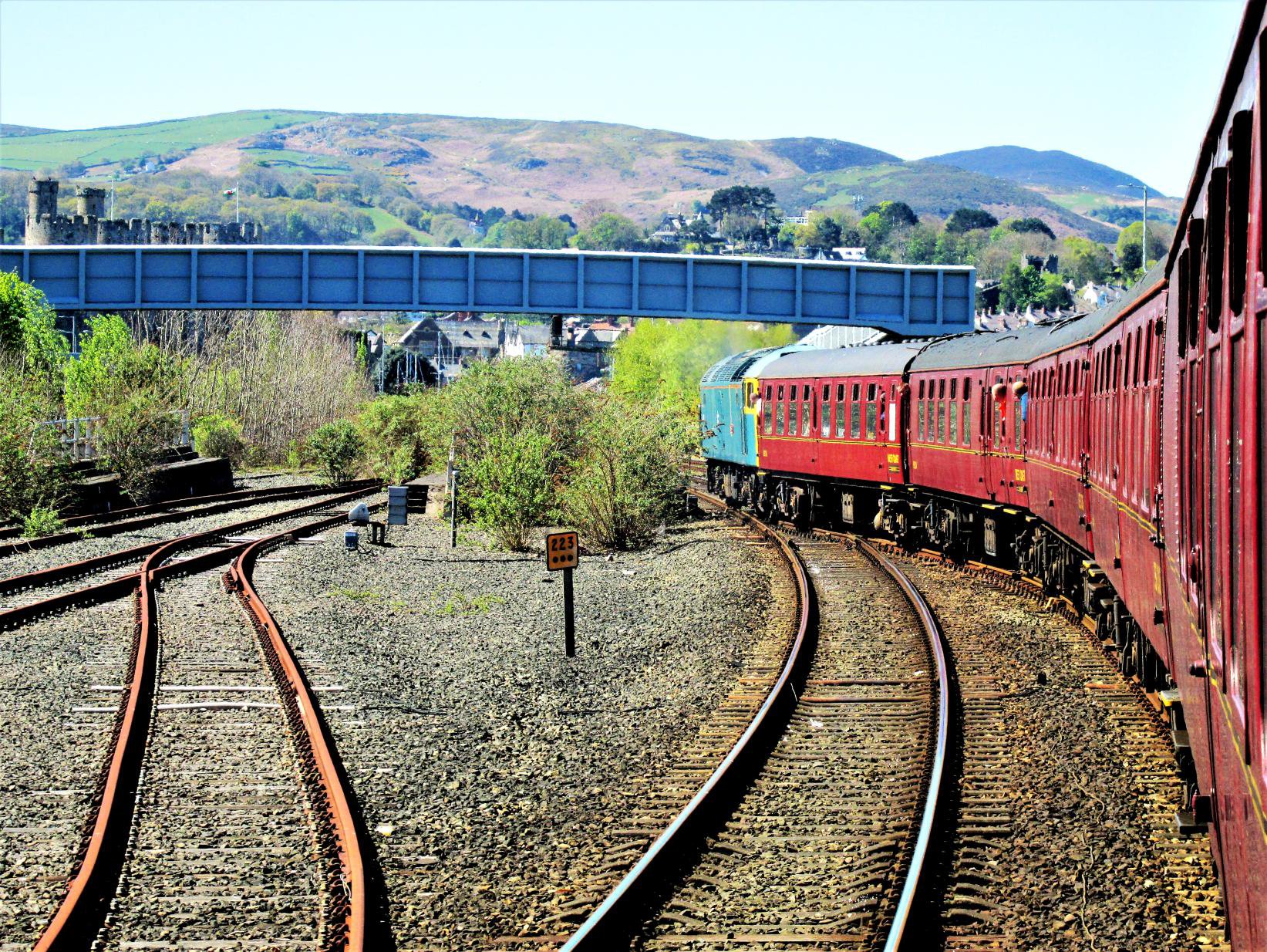 So it was finally the 'Merrymaker' section of the tour as we took the short hop to Llandudno itself and this throbbing Victorian resort with no less than three take away food outlets directly opposite the station, all closed! Obviously the mass catering arm of this jewel of North Wales' tourism (which at least differentiates itself by having a greater ratio of brick built infrastructure over caravans than elsewhere on the glorious Gogledd Cymru Riviera) had not yet built itself up to full seasonal frenzy of activity, (availability). So a wider sortie in search of sustenance was in order. In fact a selection of eateries was available a few streets away and a fish cooked to order with chips was whisked back to the train now approaching departure. Back to 'The Junction' (as the local call it) alongside the gorgeous Conwy estuary glistening in the sunshine with Conwy Castle across the waters it was... a tourist boat from Beaumaris bobbed about no doubt laden with punters photographing our train and yearning to be off their aquabash and back on the steelwork behind the vintage traction.