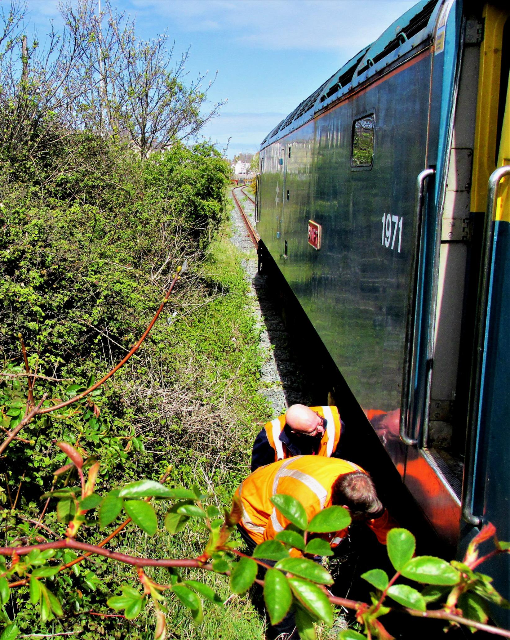 With the train stationary in Holyhead Carriage Wash Road it was noted the crew were busy removing the plate covering the speedo probe near one of the axles and it transpired this had failed. At this time this did not matter as this 47 was now trailing but would ultimately necessitate a run round much later.