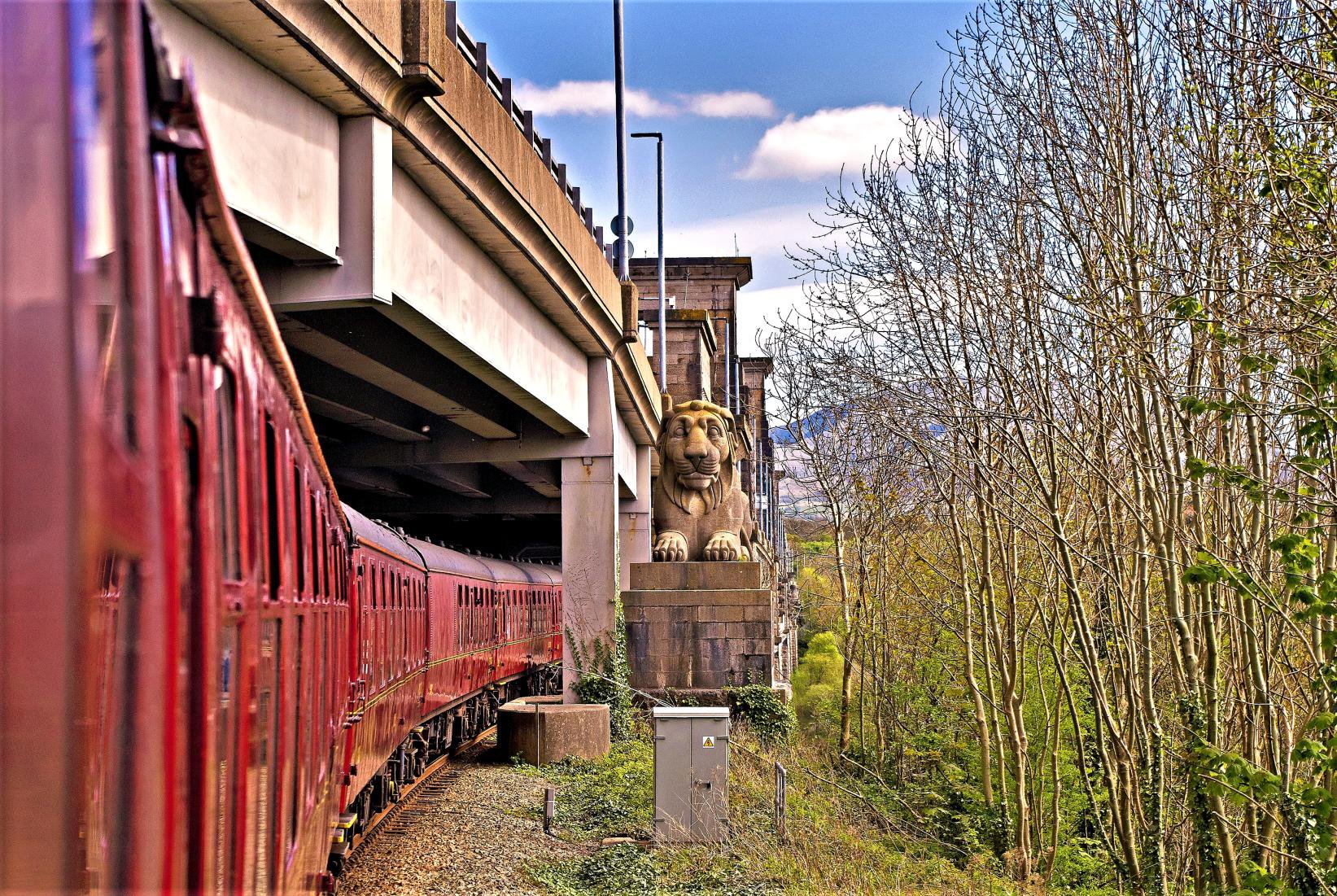 Crossing the Britannia Bridge over the Menai Strait returning from Holyhead with the mountains in the background. The original bridge, designed by Robert Stephenson, opened in 1850 and had two wrought-iron rectangular tubular spans with a track inside each tube. These were damaged beyond repair due to the tar-soaked wooden linings catching fire after boys playing inside the bridge dropped a lit paper torch, temporarily closing the line here from May 1970. A new arched span was built which reopened at the end of Jan 1972 with a single railway track. The road bridge above was added in July 1980. The original bridge was guarded by two lions on either side of the tracks on both the mainland side and the Ynys Mon (Anglesey) side; these were designed by John Thomas and remain to this day, though now difficult to see (but captured magnificently in Geoff Plumb's photos). The lions were immortalised in a Welsh rhyme by the bard John Evans (1826 - 1888), born in nearby Porthaethwy: