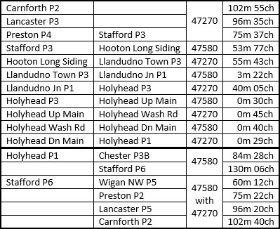 Approaching Chester we went inside on the Up slow as an NR extra but we were early and also had to allow an Up passenger working past. Then the Up Fast and to P3B via a little used crossover where a few passengers actually got off! We jinked left over another crossover (rare in this direction) onto the Down & Up Main then sped onwards to Crewe for the interesting Up Chester Independent and Up Through Siding to ultimately reach Stafford P6 (and a facing crossover missed by the morning platform change from 6 to 3). Here the leading loco ran around to avoid the speedo issue and provided the rather retro and impressive sight of double headed 47s; if only they could have worked in multiple!