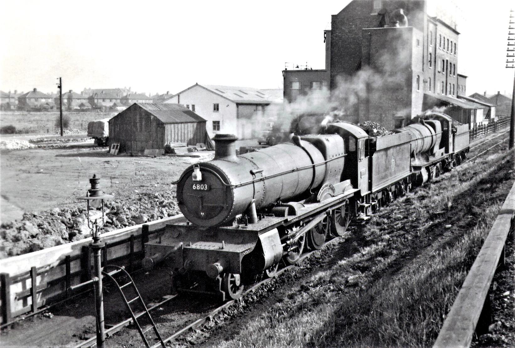What a difference 54 years makes! From the Geoff Plumb Collection. GWR Grange Class 4-6-0 No. 6803 'Bucklebury Grange' at Crewe Gresty Lane shed with a 2883 Class 2-8-0 in 1949. The small two-road straight shed was to the left of the picture, the 'Grange' facing towards it. It was a sub-shed of Wellington (Salop),