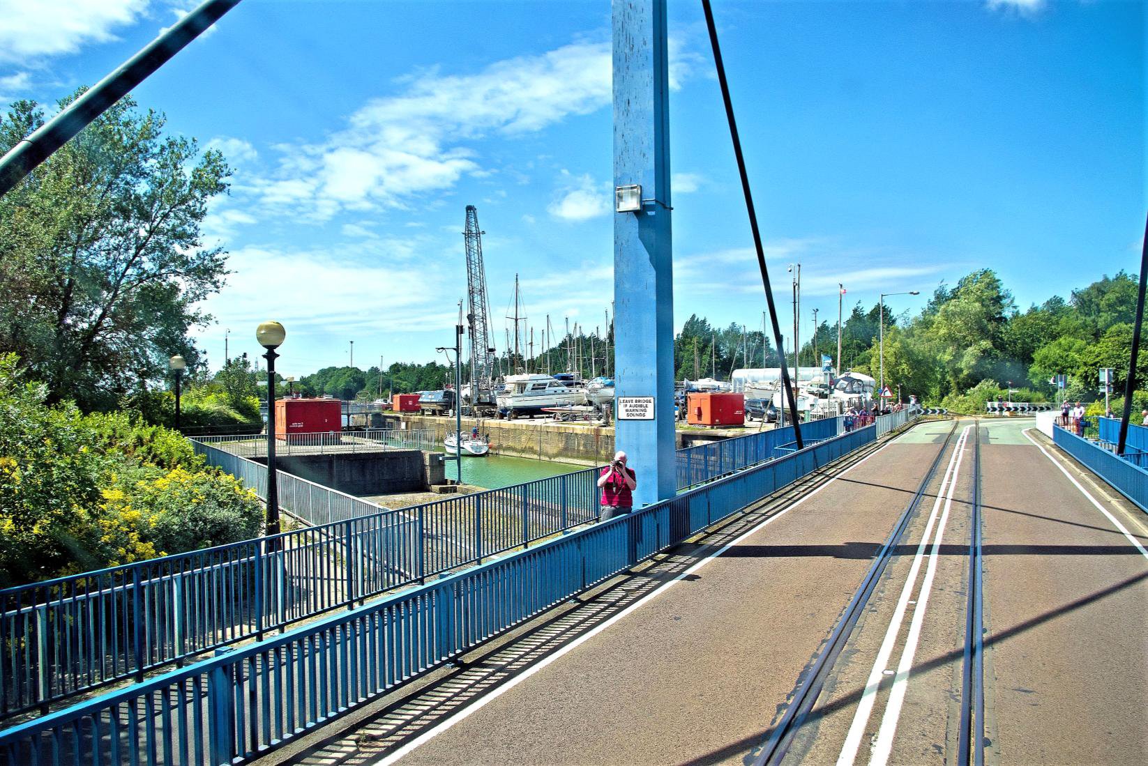 Our photographer photographs a photographer photographing our photographer! The tour has passed over the Maritime Way level crossing and is on Ashton Swing Bridge over the entrance to the former Albert Edward Dock, now a leisure marina. The bridge is shared by rail and road (Navigation Way), but is closed to road traffic during rail movements! (See also BLN 1283.X92 picture.)