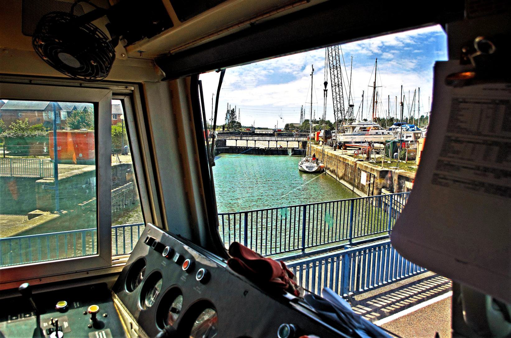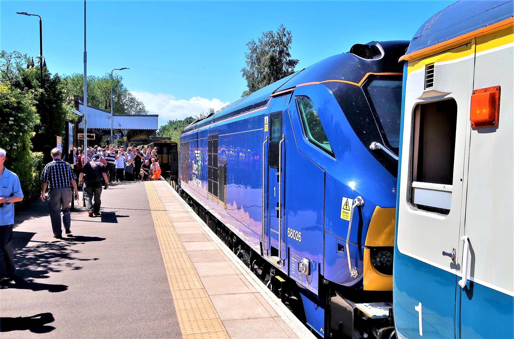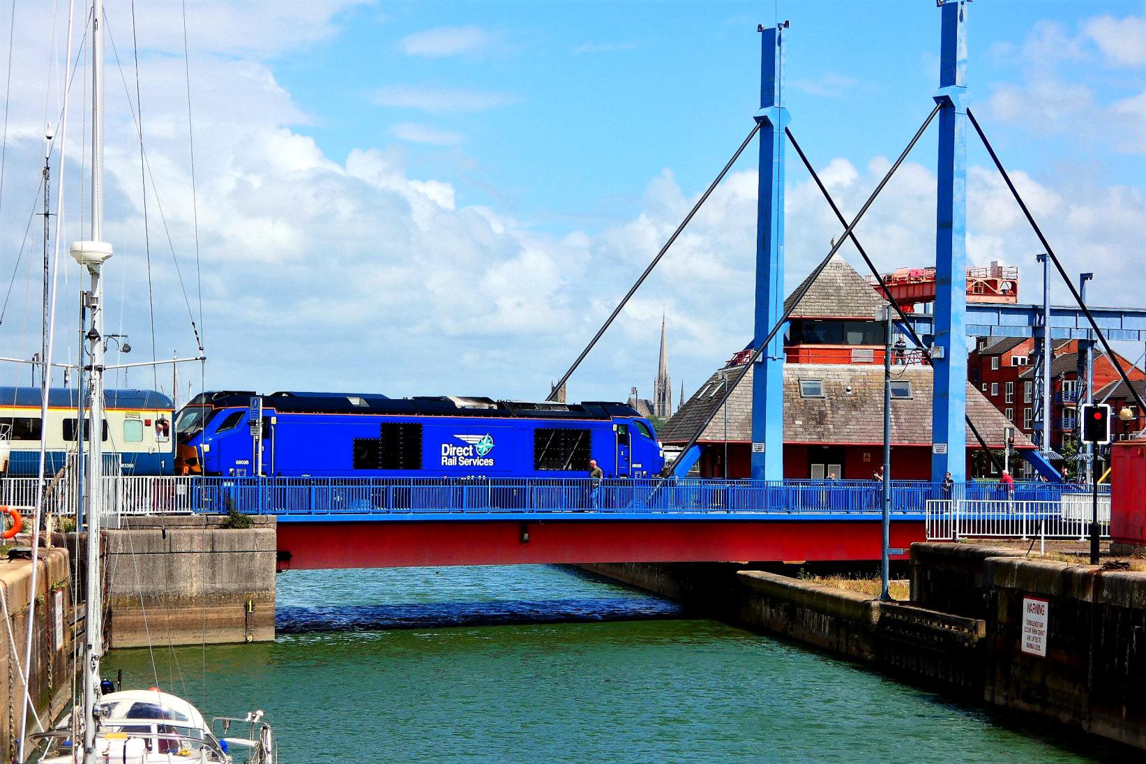 Then it was off to our first destination Ormskirk 'termini', unusually loco-hauled, passing the beautiful village of Rufford and a bouncy bus, Class 142, and various barges stationed in Fettlers Wharf Marina. The Good Beer Guide was reviewed and a village pub noted for future reference. Our Up arrival at Ormskirk was actually 'down' by a few minutes, and with the particularly short platform, stewards ensured that no-one opened an incorrect door and fell out. Following the short interlude which included passengers trying to get the elusive photo of the advertised 13.24 to Preston with the Class 68 in the background, it was time to get the Cat to the Dock with a change of headcode and direction.