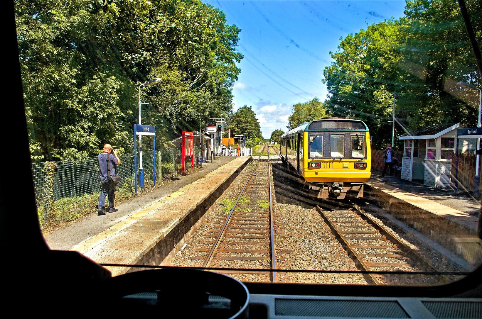 An unusual event, trains crossing at Rufford (although both lines are unidirectional); the 12.35 Preston to Ormskirk is on the right. The crossing gates are down and the signal is cleared for our tour.