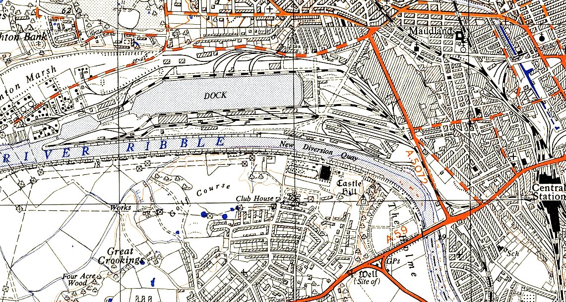 1:25,000 map 1937-51 of Preston Dock. Preston Fishergate Hill station (see Preston Walk report) is just left of the bottom right corner.
