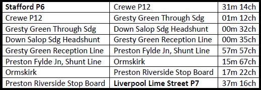 Even Big Cats can be unsteady on their feet but, after slipping (even on dry rails with sanders in use), we safely made our way back up the 1:29 incline to station level at Preston, powering off to our final destination of Liverpool Lime Street. Again routed via the Slow lines we finished off the Up Goods to the south of Preston and the Up Slow to Balshaw Lane Jn. Hitting top pace on the Up Fast, the cheetah-like Class 68 took us to Wigan and then via Springs Branch Slow Lines Jn, on to the St Helens line for our final highlight of the day, Ravenhead Down Goods Loop. All went to plan and we were tickled by seeing the left feather being given and taken, allowing the red pen to come out for many. Finally the run to Liverpool Lime Street arriving 16.02, for the train to 'when empty return to Crewe'. This was for its main purpose over the next few days, the annual Three Peaks Rail Challenge by Rail.