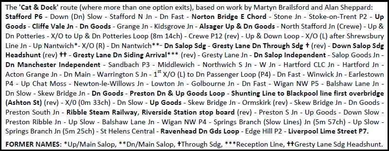 By now those rare tracks were coming thick and fast. Stoke P2 was traversed in the usual direction, but then the weaving started, first a step or two to the right to cover the Up Goods, and then a jump or three to the left at Cliffe Vale Jn to cover the rest of the Down Goods to Grange Jn; there was no hands on the hips at any point. This was an incredibly rare move, a Kev Adlam 'on the day surprise', special formerly used by freight trains from Cockshute Sidings, the local yard, to Crewe etc. This came as a surprise/shock to some who joined later at Crewe and then rather wished they had gone to Stafford instead!