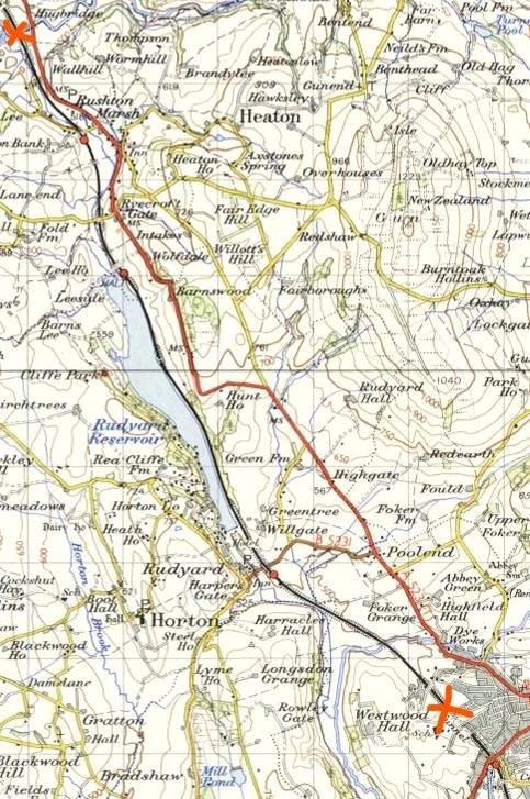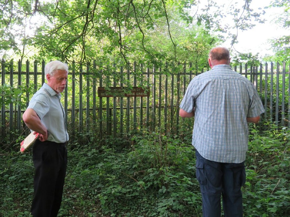 Having sorted out the car-positioning, ten of us met in Oakwood Rd, Leek at the start of the trackbed path (SJ 971568). First we went further south in to the town through a cutting leading up to the overgrown and infilled Leek tunnel portal. (Bottom right cross by Leek on the map below.) Then we returned along the delightful route enjoying the lovely summer evening. There is plenty of room by the path on this once double track route (North Staffordshire Railway (NSR) Uttoxeter to North Rode line) to take a 10¼" gauge railway as well! Talking of which, at Rudyard station we followed the Light Railway visited earlier. At Hunthouse Wood No5 'Rudyard Lady ' was working an evening weed spraying train. Traces of the former Rudyard Lake Halt (a request stop) were found. Then it was the fine Grade II listed station: Rushton, undergoing renovation, which survives in good condition along with parts of the platforms and a semaphore signal that once protected the level crossing. It is adjacent to the 'Knot Inn' - once 'The Railway Inn' - with a Stafford (not 'Staffordshire) knot in the brickwork (the NSR was 'The Knotty'). 'Rushton Spencer' is the name of the parish; the village and its station wee 'Rushton'. The trackbed path continues to the Staffordshire way crossing (SJ 930633) but being BLS Members the group naturally went further to the River Dane where the impassable railway bridge is securely fenced and overgrown. (Top left cross on the 7th Series 1959 1" map below.)