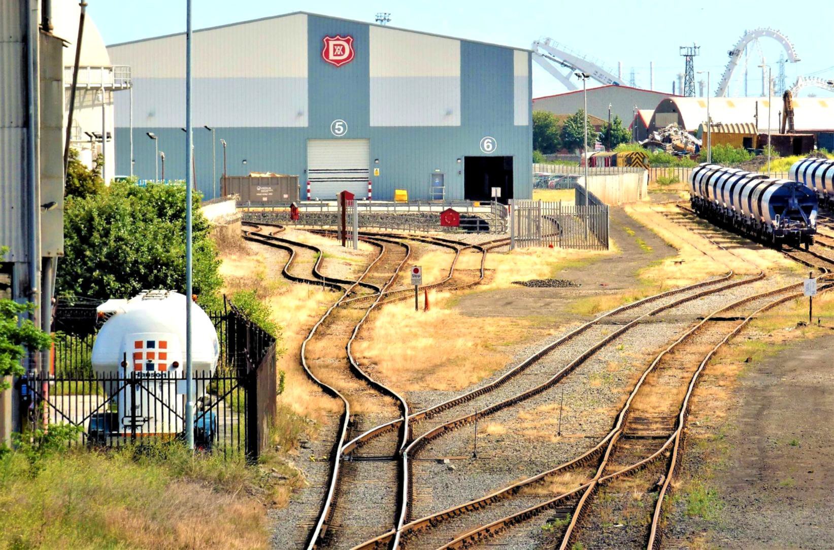 The view north from the Metz overbridge; the Intermodal and Ayrton Terminals are round to the left, door '6' is the rail access to the massive Automotive Steel Storage Terminal and '5' is road access. The wagons (top right) are in the yard and the tour train is behind them in the background on the River Tees Quay branch.