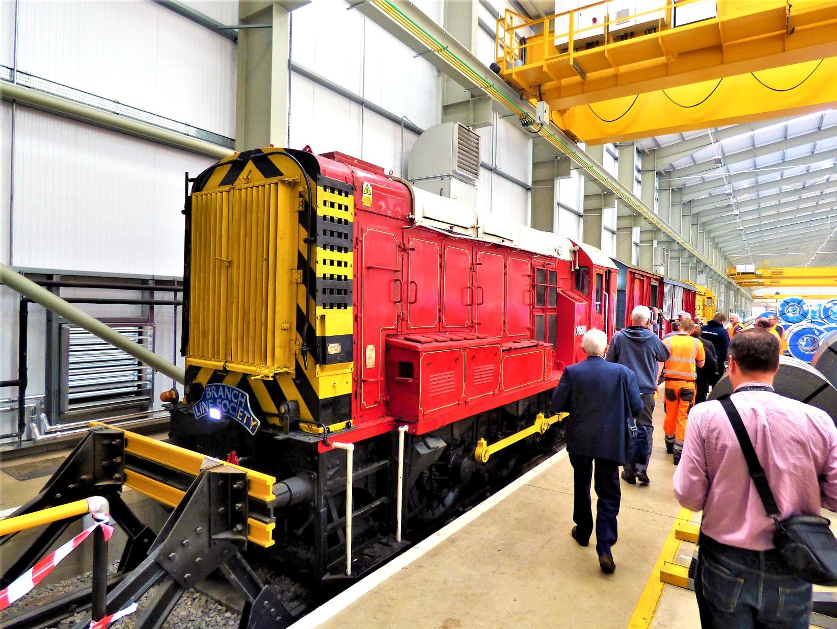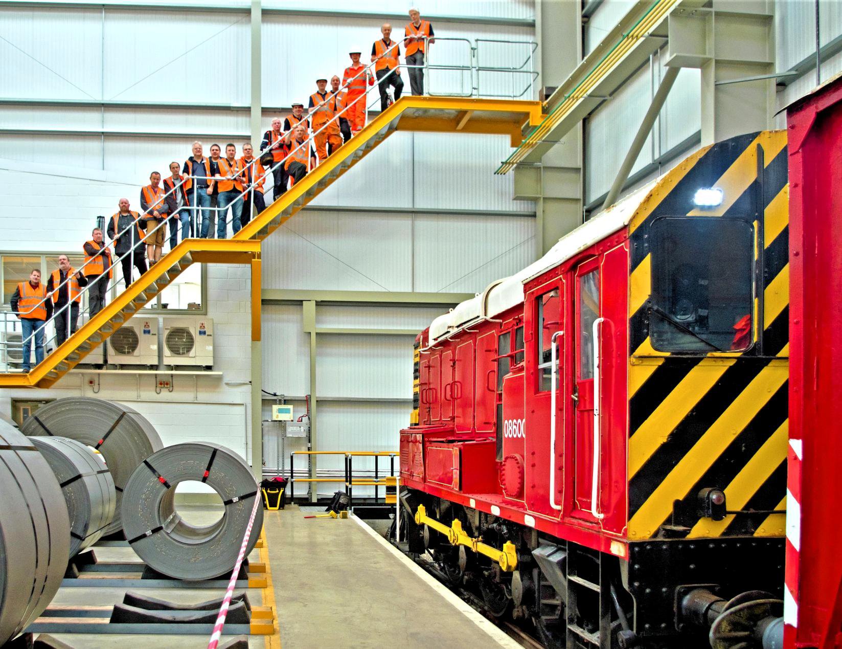 We then walked down stairs to the Automotive Steel Storage Terminal to board our railtour formed of ex-ferry wagon 'Molly' (see footnote) recently acquired from the Wensleydale Railway, brought in specially by road and 'topped & tailed' by 08600 in Dawson's distinctive red house livery and 08598 in Potter Group yellow. This massive building was opened in 2015 and provides over 100,000 square feet of storage in a perfectly controlled environment (temperature and humidity) for highly specialised automotive steel. This is achieved with mostly 'green energy' including geothermal heating.