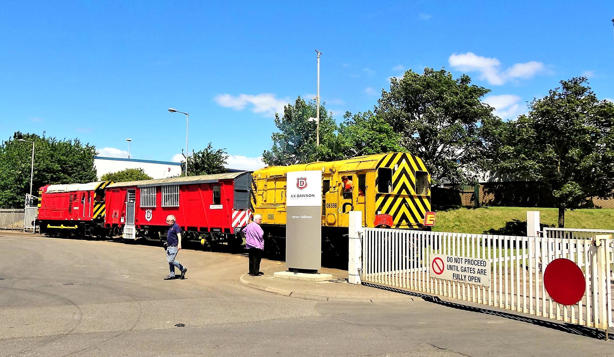 After a final reversal at 6 points, we returned to the Automotive Steel shed again to disembark. However, the fun was not yet over. There were more runs of the train and many of us took the opportunity to photograph them from various public locations. Dawson's also kindly invited us to walk around the Ayrton Terminal so that the unloading facility could be viewed close up, along with 08774 specially moved to where it could be seen from the tour and on foot (the remains of 08912 were also on view).
