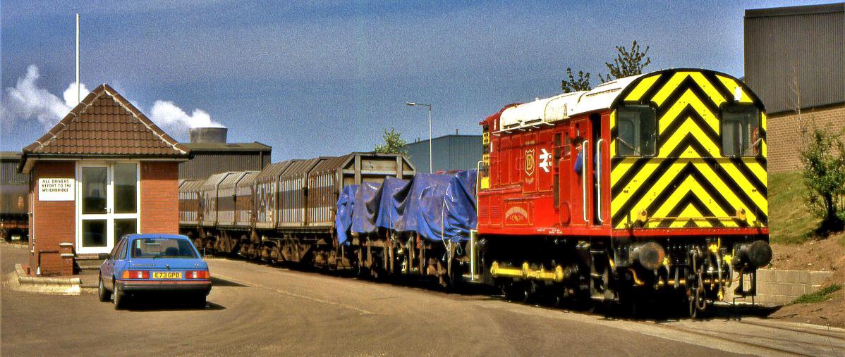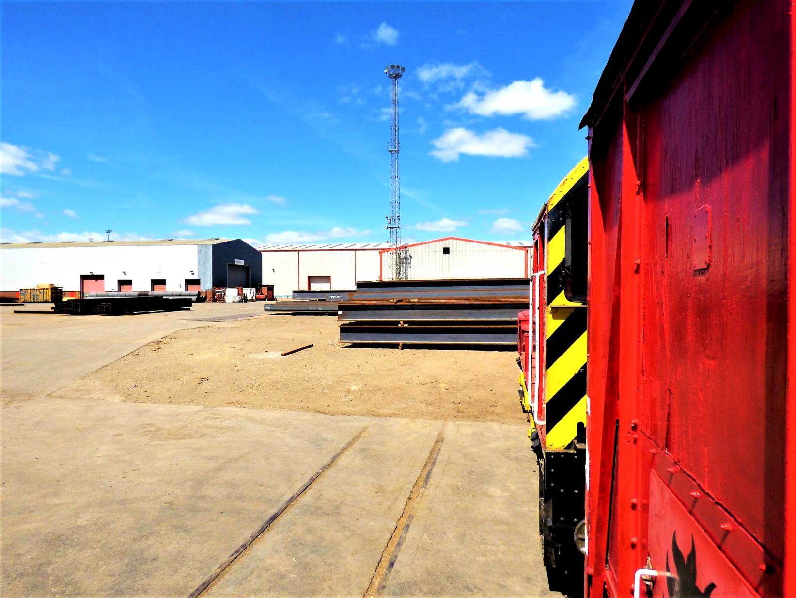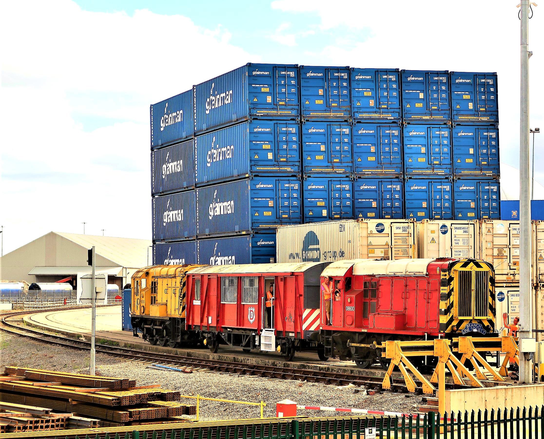 These are taken 3 or 4 at a time down to Ayrton Terminal by one of Dawson's 08's and propelled through the discharge shed (an undertrack unloading facility). No freight traffic was operating on the day of our five charters, being a Sunday. Non-runner 08774 'Arthur Vernon Dawson' was stabled on the discharge road, allowing everyone on the train to have a decent view of it. Back up to 22 points, another reversal took the tour to the Intermodal Terminal. This is primarily for containers but recent uses have included inbound construction materials for the new Woodsmith Potash Mine near Whitby, and storage for scrap JIAs. The Class 08 shunters are also sometimes stabled here between jobs.