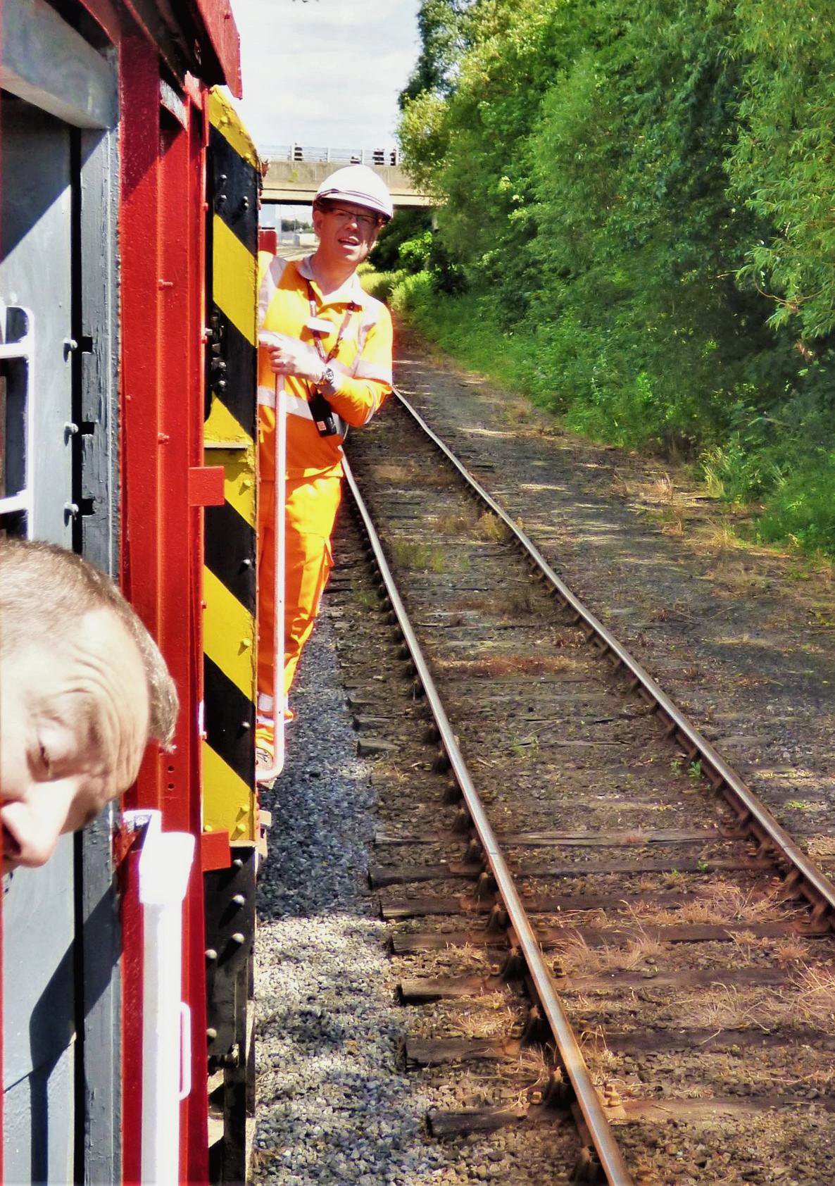 The train stationary at the NR boundary (behind the camera), looking north. Behind train manger Kev's hard hat, in the background is the bridge