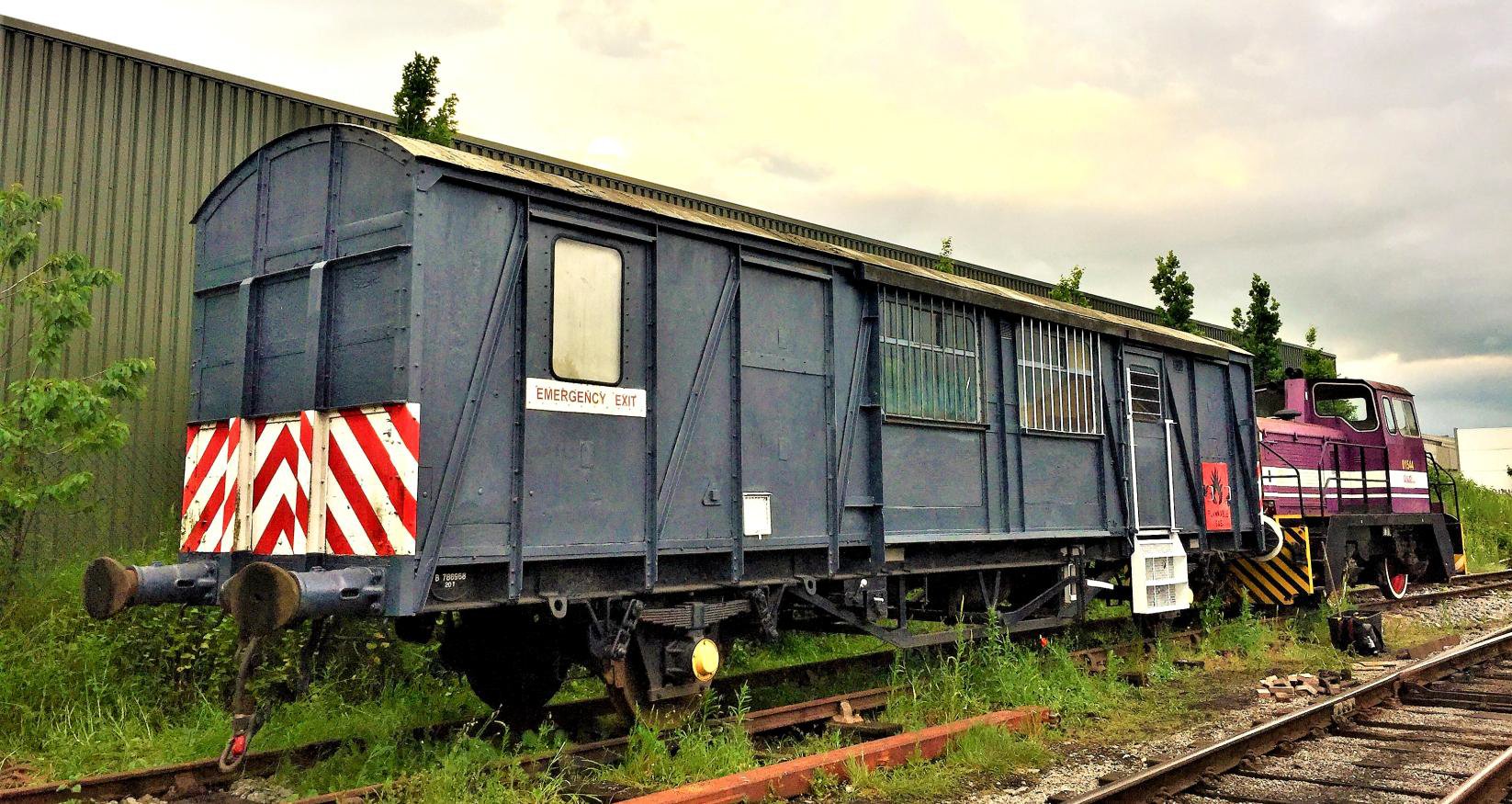 The Society has become a Rolling Stock Owner, acquiring a 4-wheel 20 ton non-ventilated ex-Ferry Van B786968 'Molly' originally with sliding doors. Her debut was on our 25 Jun AV Dawson tours. The van was built for BR in 1961 by the Pressed Steel Company, 46ft long over buffers. In BR ownership she was converted at Lowestoft into a mess van with a door, emergency exit, and two windows each side. The van had been on the Wensleydale Railway (WR1117) OOU for some time and will hopefully come in handy on many future occasions. Although unlikely ever to run on the main line, it is perfectly sound and can cope with curves of radius as small as 2½ch, making it ideal for the type of remote lines our members love to explore!