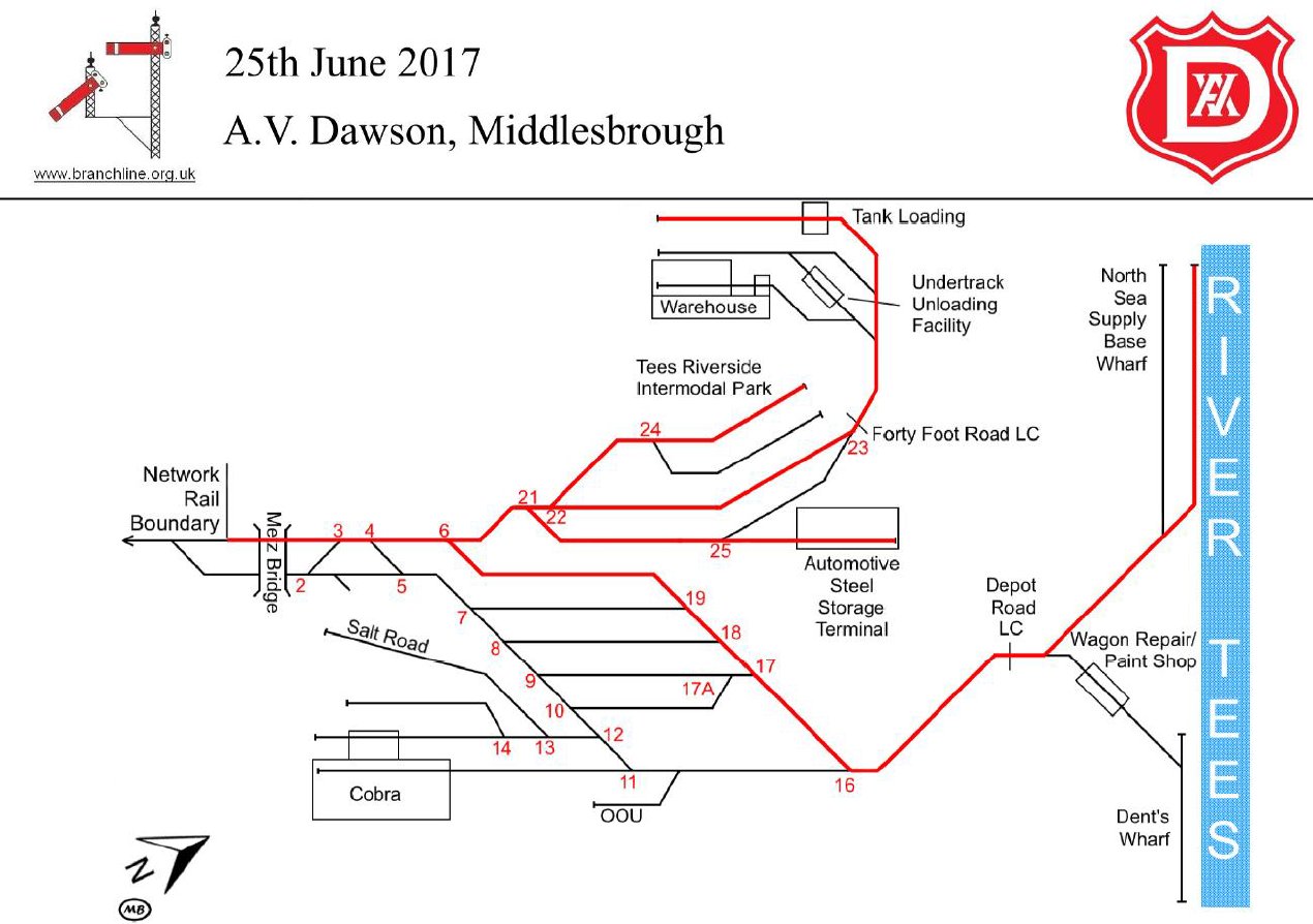 A massive thank you must go to Kev who, as always, had put many hours of hard work into the meticulous planning (it showed) with numerous site meetings and also his hard-working group of stewards. Special mention of the Dawson's staff who pulled out all the stops to give us a highly interesting and enjoyable tour with a fascinating glimpse into this very successful railway and freight facility. It is quite incredible and a tribute to all involved that an event like this can be staged in 2017. https://goo.gl/P1ckSN is a report with a video and pictures from the local press. e-BLN 1287 has historical notes about the fascinating complex area by Geoff Blyth (who once lived in Middlesbrough) with maps by Dave Cromarty and an unmarked track diagram by Martin Brailsford.