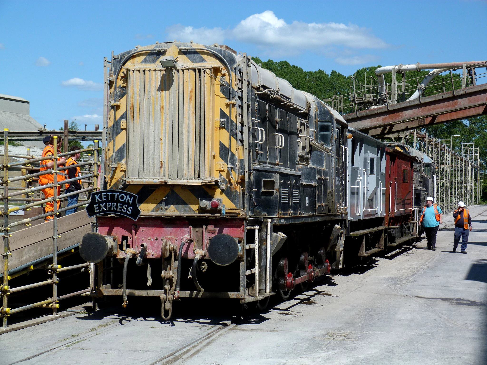The summer Saturday dawned sunny and warm. Kev, Martyn Brailsford, Graeme Jolley and myself were stewards for the day [very altruistically foregoing an attractive non-BLS railtour elsewhere - Ed]. A temporary platform (to industry specification plans prepared by the Society) had been constructed on the original line into the works, dictated by security considerations to minimise public access to the wider site. The free public rides, with a specially made 'Ketton Express' headboard on the loco, were delayed as AB2088 had brake problems due to a dip in the track catching a drain valve. All those on the Sunday rides will have felt this dip! The valve was quickly fixed in the plant's workshop and public rides were soon underway. They were busy all day with a short lunch break for coaling and watering (stewards too!). Over 1,000 people were carried on 17 trips; £300 was collected for Hanson's chosen charities. We all thoroughly enjoyed stewarding and it was clear that the public also enjoyed the trips. After the public had left, several moves took place to ensure everything was in the correct position for Sunday. There were five crippled wagons that had been on site for some years and Hanson had hoped they would be moved. Unfortunately, this had not been possible so they were taken to one of the exchange sidings. The Railway Magazine published a picture of one of these trips with photos and a short article on the public event. The weekend featured in many other publications too including Railway Herald, Rail Express, the local press and even made BLN!