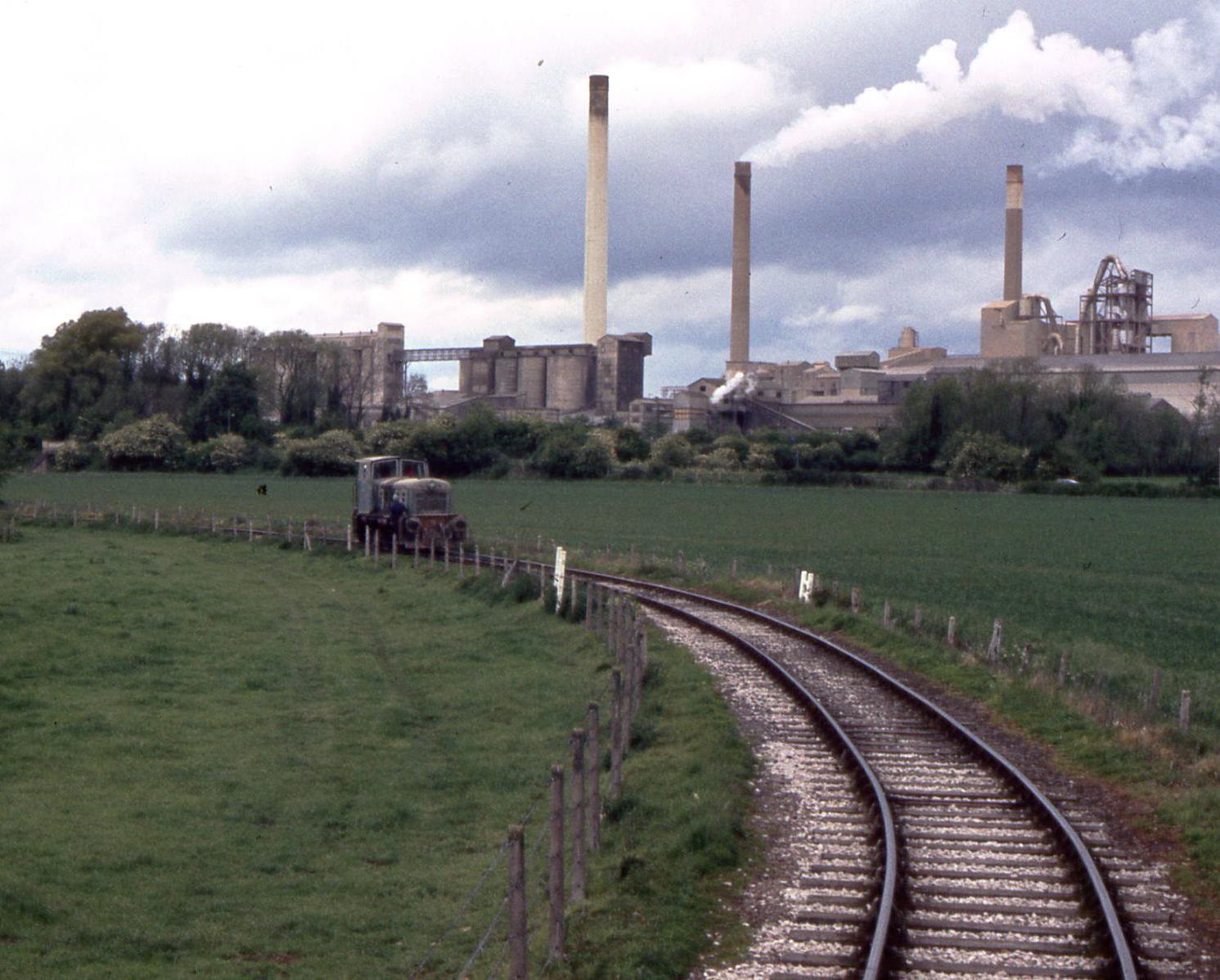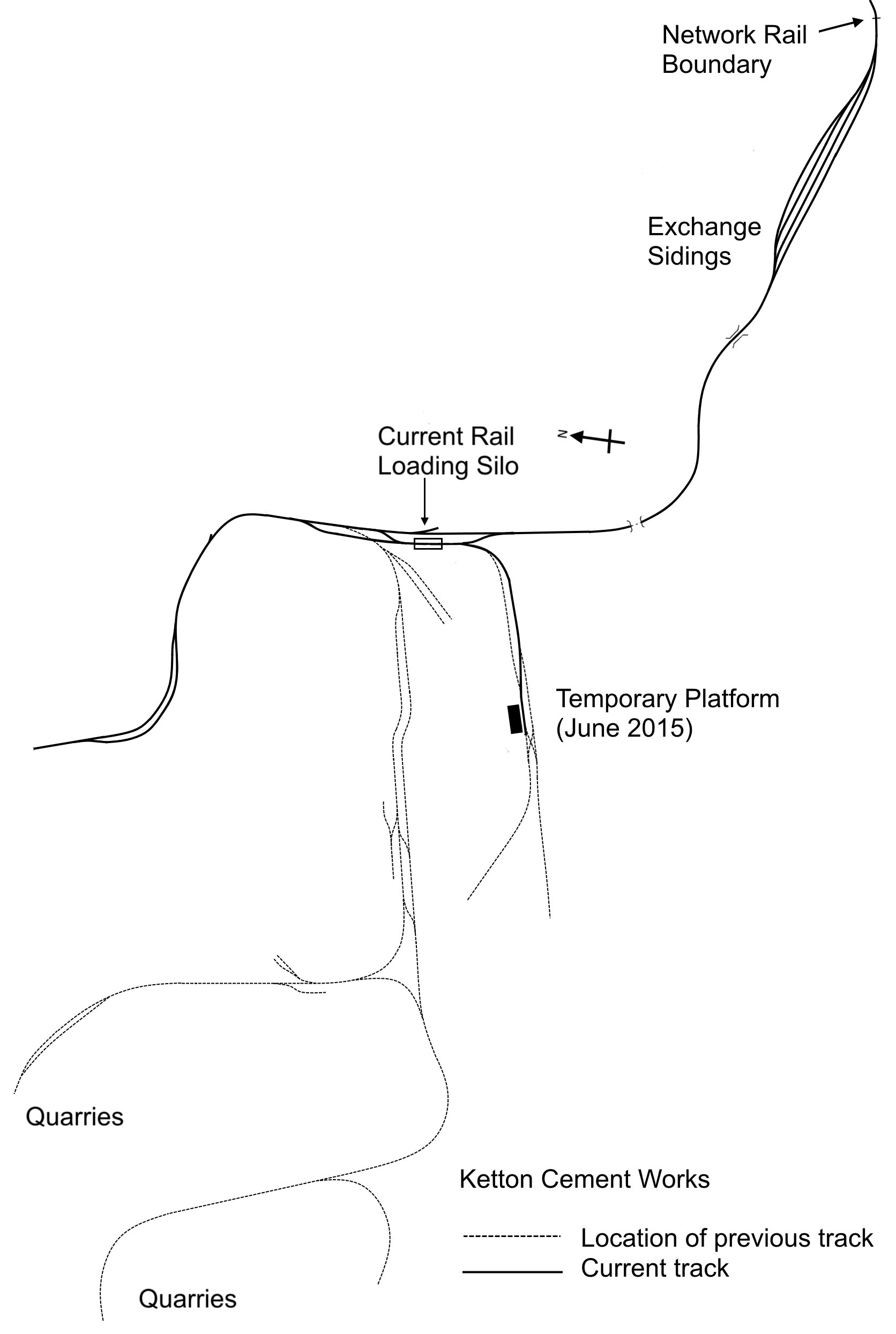 With thanks to Martyn Brailsford, the present (solid lines) and previous layout (dotted lines) is shown at this Hanson works railway above. It is still known in railway parlance as 'Ward Sidings' from Joseph Ward who expanded the works in 1927 and was the brother of Thomas W. Ward (chairman of the group), well known in the scrap metal business etc. The existing lines were all traversed by our four comprehensive charity track tours on Sunday 7 June, other than the short sections occupied by rolling stock. The works local quarries' (high quality silica clay and limestone) internal lines were replaced by large dumper trucks and conveyors as production rapidly expanded to 700,000 tonnes annually in the 1970s. One factor in the expansion of the plant over the years was its close proximity to the Leicester to Peterborough railway; the NR connection, top right on the map, is at 7m 60ch just west of Stamford. There is a daily bulk powdered cement train SSuX to King's Cross (still known as 'Churchyard Siding, Castle Cement', the latter being the brand name in the 1980s); the dedicated four-wheeled tankers are discharged pneumatically. Other locations are served less frequently and coal is brought in by rail occasionally from Immingham, Hargreaves Coal Terminal and New Cumnock to the relatively new branch extension (top left) to the coal unloading terminal with its run-round loop. Its first passenger trains were our June trips. A range of waste materials is burnt at Ketton to reduce coal use, including tyres and plastic mixed with shredded paper. A 12MW solar panel farm (amazingly 50,644 modules on 27 hectares) at the quarry produces 13% of the works' electricity.