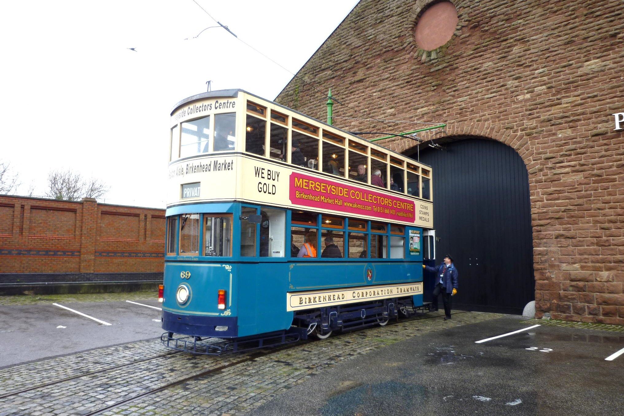Tram no.69 at the doors of the former Pacific Road depot during our visit to the Merseyside Tram Preservation Society on the Wirral on Saturday 6th February 2016. [© Howard Everitt 2016]