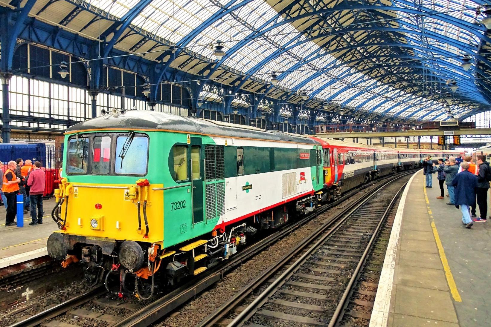 On 12th March 2017 at Brighton, 73202 couples up to 442402 ready to depart for a trip through Lovers Walk Depot on our Southern Class 442 Farewell railtour.