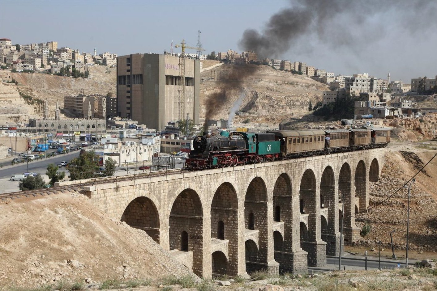 A run past on the impressive 'Ten Arch' stone viaduct in the suburbs of Amman during our Jordan tour 10th to 15th May 2017. [© Iain Scotchman 2017]