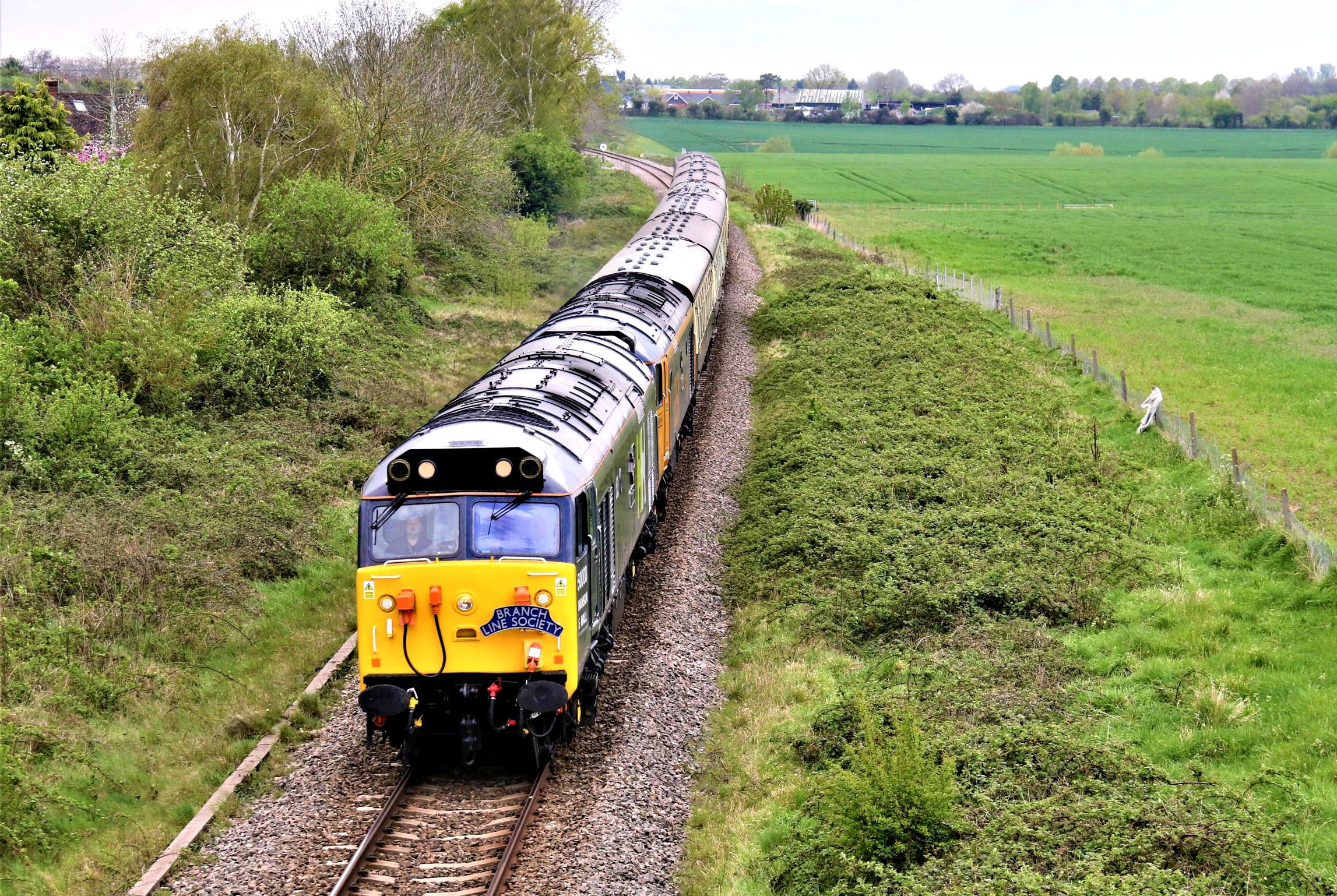 On 22 April 2022 the Honeybourne Hoover railtour passes Wyre Piddle hauled by 50008 and 50007. [© Neil Berry 2022]