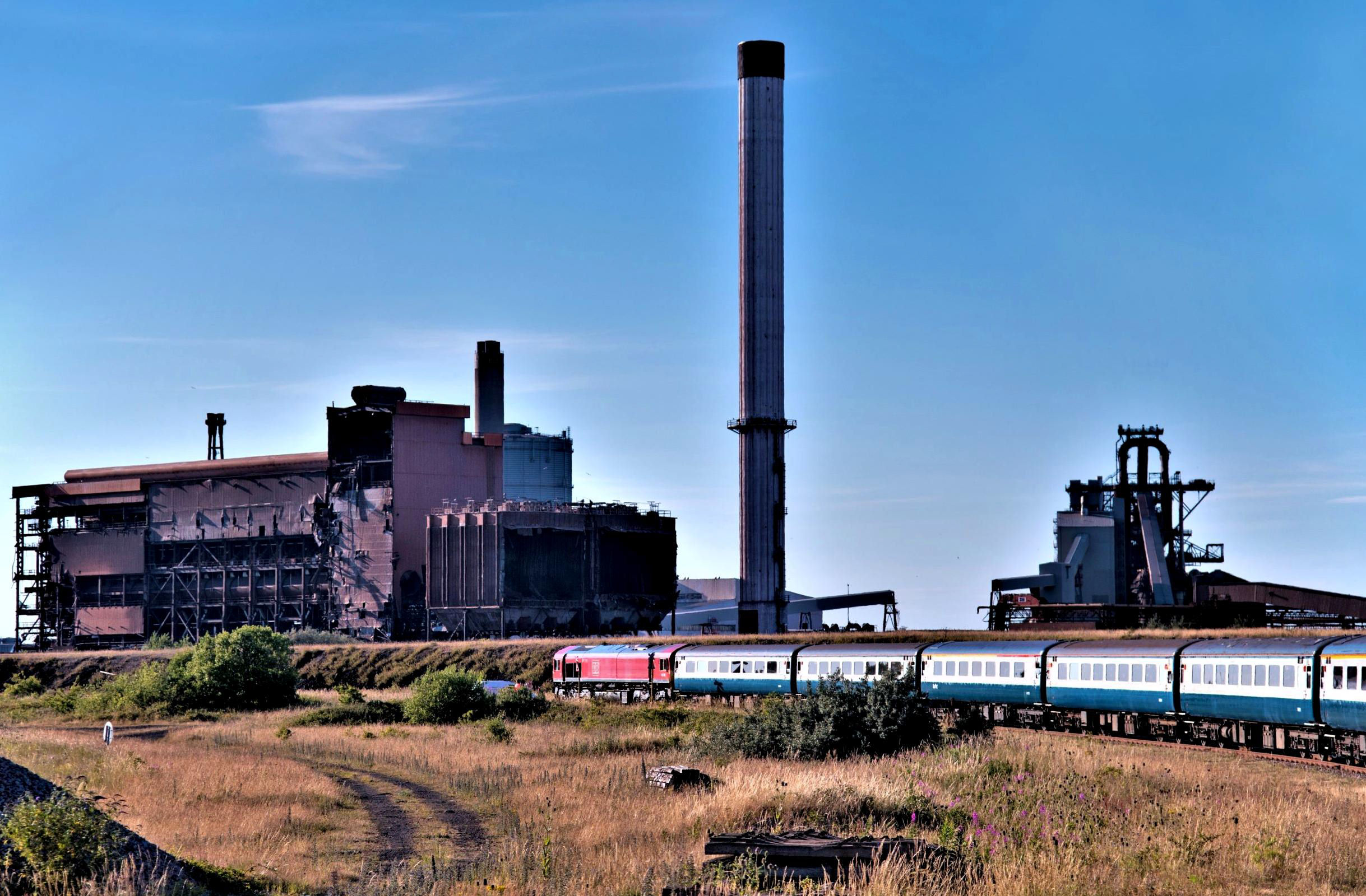 On 9 July 2022 our Lackenby Looper railtour approaches Redcar Bulk Terminals, passing the Sinter Plant, left (since demolished) and the Blast Furnace, right. [© Tony Miles 2022]